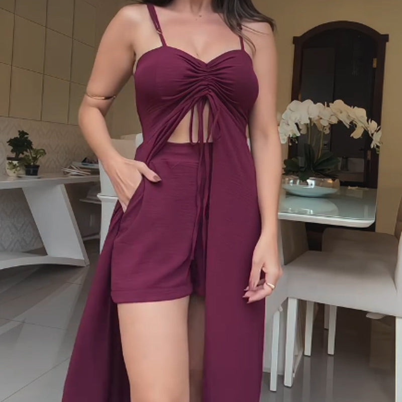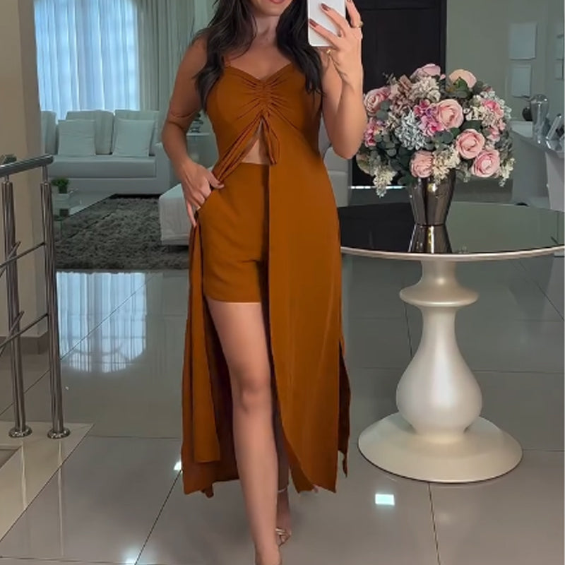 🔥2025 Summer Hot New Arrivals~👉Women's Fashion Solid Color Spaghetti Straps Long Top & Shorts Two Piece Set⏳Time Special: 50% —✈️Free Shipping 📦