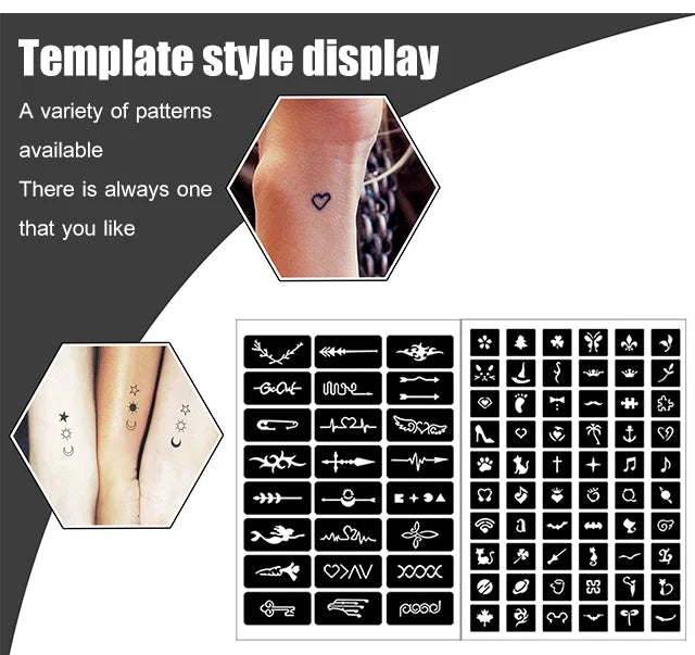 A wide range of DIY body art fashion. It includes 3 colored bottles of tattoo ink, 10ml each, and 2 sets of tattoo templates. Enjoy the fun of creating your own tattoo!